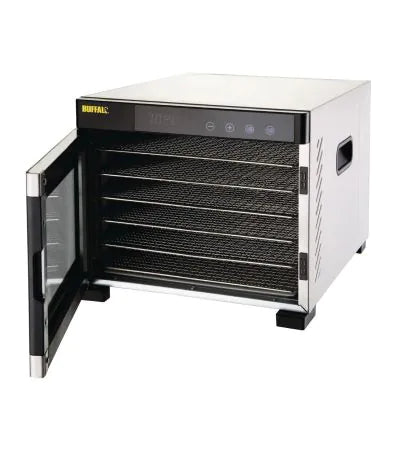 A compact food dehydrator suitable for preparing homemade dried snacks and ingredients in the kitchen. Includes six trays for drying fruits, vegetables, herbs, or meats in batches, with digital controls for managing temperature and timing. Ideal for short-term use during meal prep, healthy eating projects, or small-scale food preservation without needing to purchase a permanent appliance.