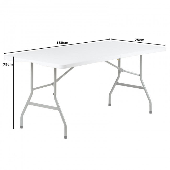 A 6ft folding trestle table suitable for providing extra surface space at outdoor gatherings, camping trips, picnics, parties, and temporary event setups. Features a high-density moulded plastic tabletop that is easy to wipe clean, making it practical for food service or group activities. Lightweight with a built-in carrying handle, ideal for short-term indoor or outdoor use where portable table space is needed.